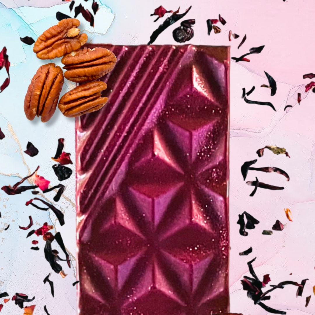 Chocolate and flowers in one, this bar is the perfect gift for your luvvie. Creamy milk chocolate envelopes rose petals, hibiscus, freshly toasted pecans, and sea salt.